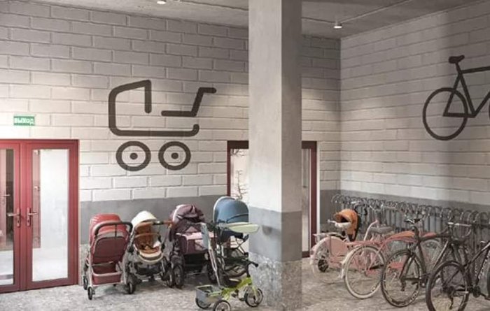 Помещения для хранения калясок и велосипедов + кладовые помещения на каждом этаже.