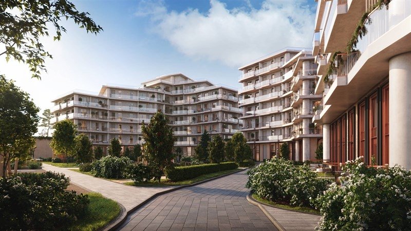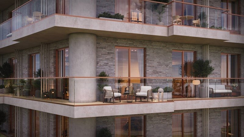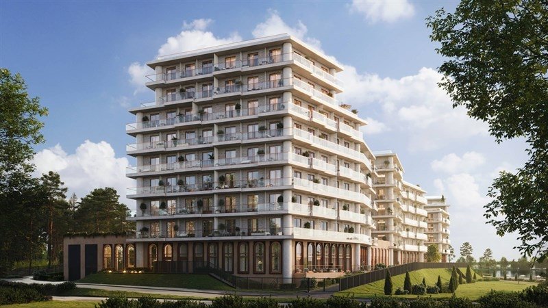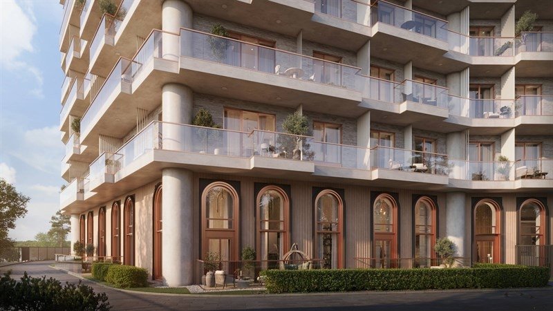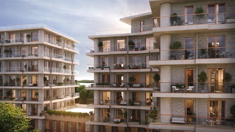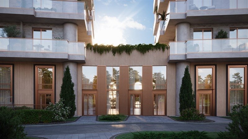 Архитектурный силуэт дома формируют пять секций от 6 до 10 этажей, панорамные окна, открытые балконы, террасы со стеклянным ограждением и арочные своды.